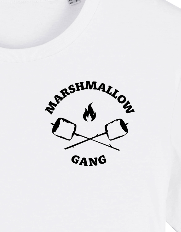 Schickes weißes Shirt aus Bio-Baumwolle mit "Marshmallow / Gang / Grillen" Druck.
